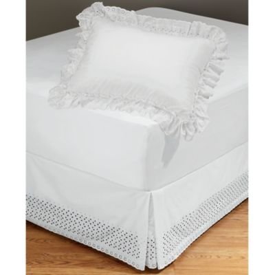 Bed skirt and shams Easy-care woven polyester/cotton Machine wash and dry Imported Specify white or ivory An eye for style. A traditional eyelet pattern with scalloped edges add a feminine finishing touch to this Vienna Eyelet bed skirt. This easy-care bed skirt is available in three drop sizes to accommodate a variety of bed heights. Choose from white or ivory and add delicate flair to your bedroom decor. A lovely look, this classic and charming eyelet bed skirt will never go out of style. Dimensions: 14" Bedskirt: Twin 39x76+14" drop, Full 54x76+14" drop, Queen 60x80+14" drop, King 78x80+14"drop. 18" Bedskirt: Twin 39x76+18" drop, Full 54x76+18" drop, Queen 60x80+18" drop, King 78x80+18"drop. 21" Bedskirt: Twin 39x76+21" drop, Full 54x76+21" drop, Queen 60x80+21" drop, King 78x80+21"drop.